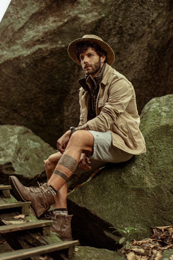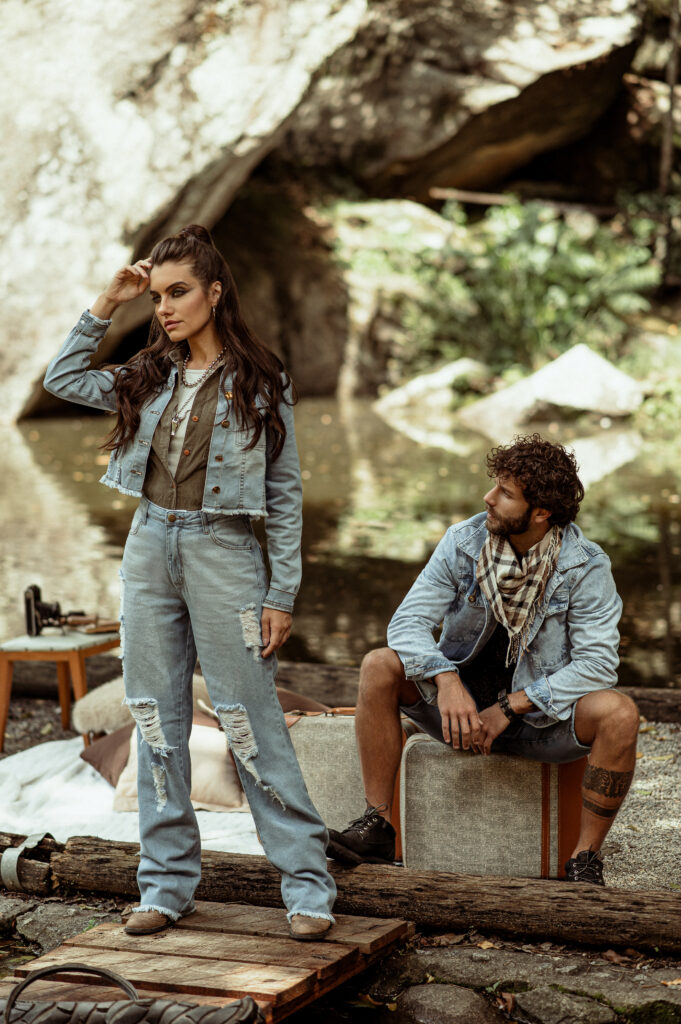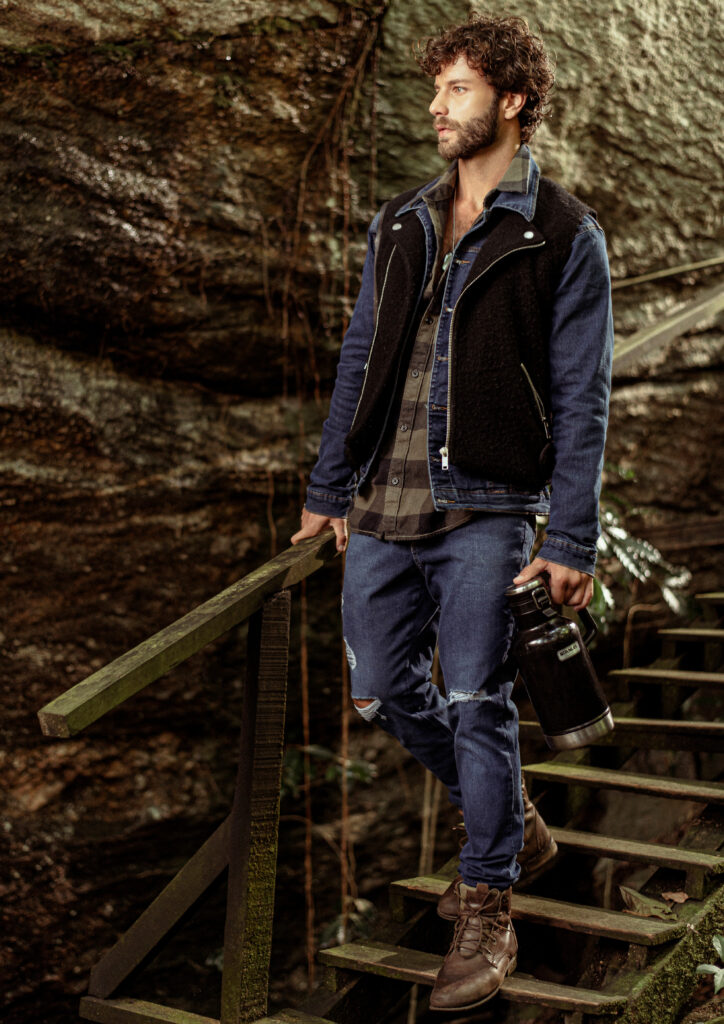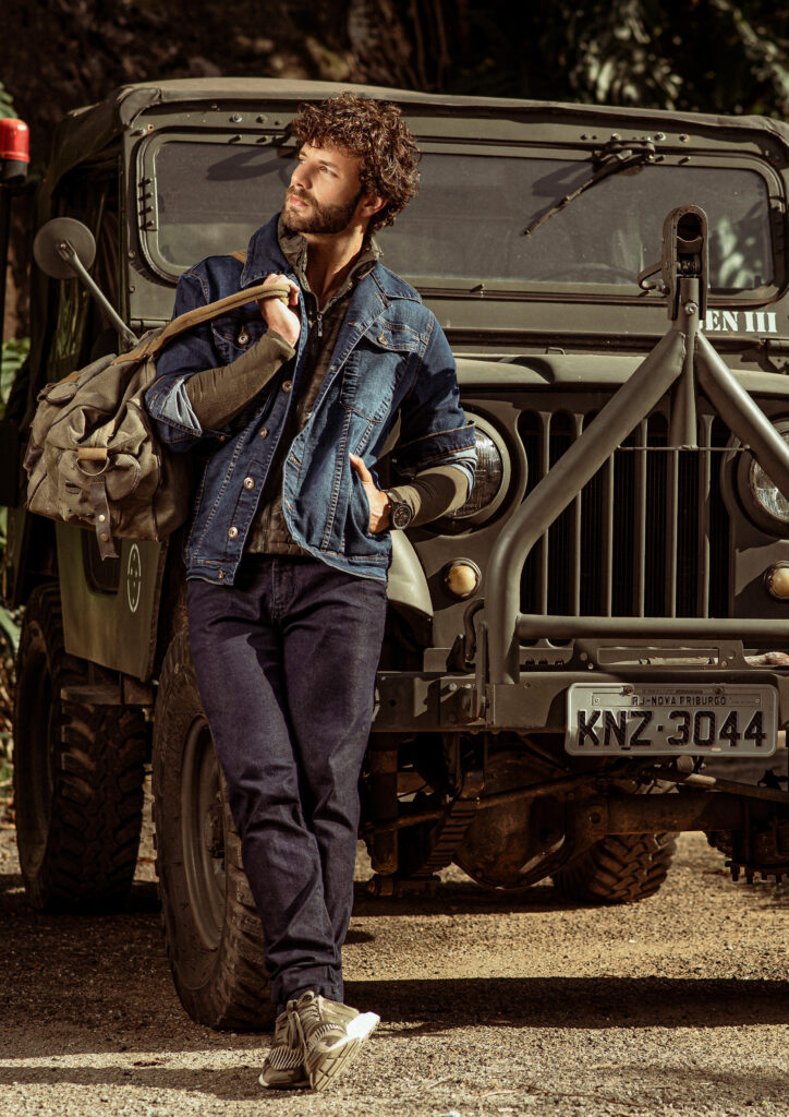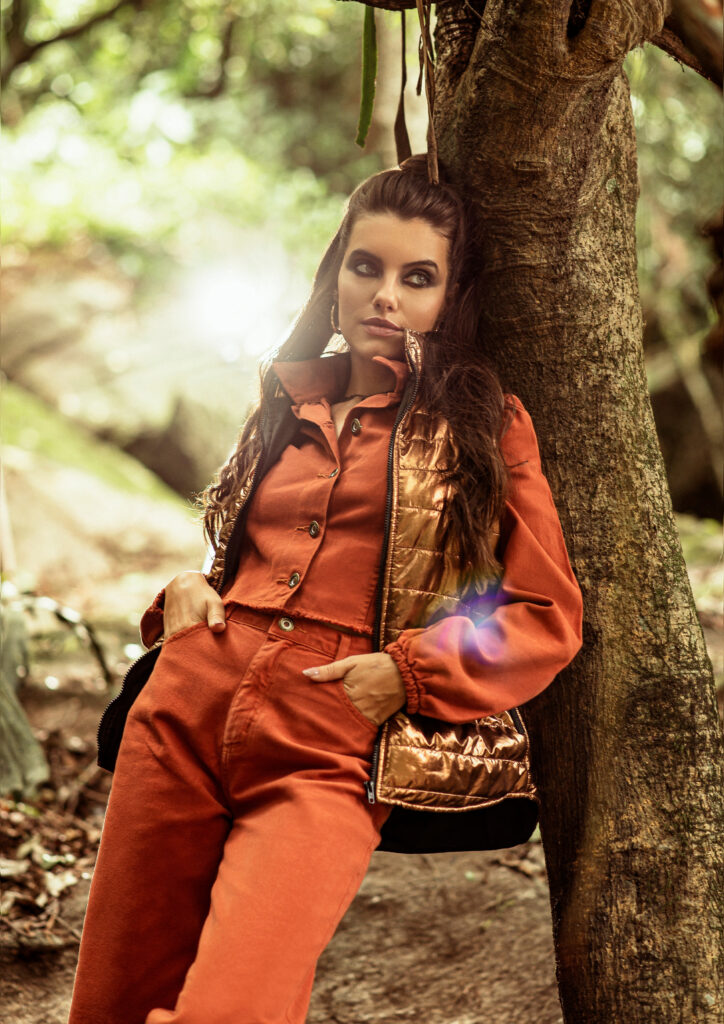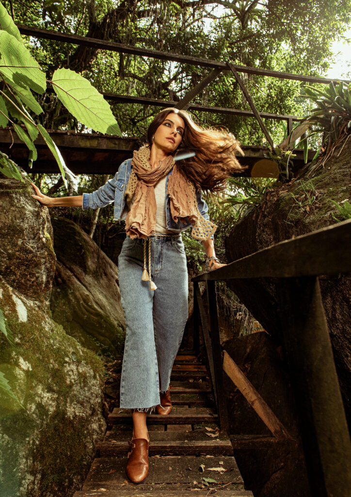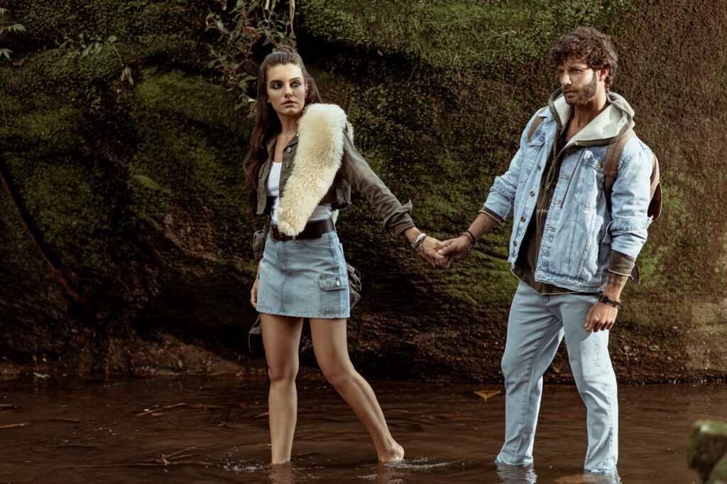 A partir desse conceito nos inspiramos em filmes como Jumanji e Indiana Jones que são grandes referências desse espírito explorador e aventureiro. A locação escolhida: um parque da Cidade que se encaixou perfeitamente em tudo que estávamos buscando, uma floresta para desbravar. Todo o styling, a paleta de cores em tons terrosos e muito verde. Os objetos de cena, os acessórios, a escolha dos perfil dos modelos, a atitude de cada um deles foram pontos estratégicos para contarmos nossa história. Toda essa curadoria é essencial, para que o público consiga imergir completamente e embarcar na nossa jornada.