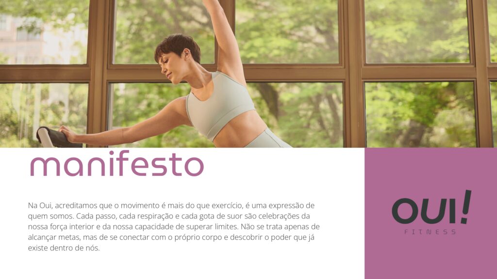 Desenvolvemos o branding da Oui! Fitness com um propósito claro: acolher, inspirar e transformar. Trabalhamos para construir uma identidade que se conecta emocionalmente com cada mulher, transmitindo a ideia de que, independentemente do ponto de partida, a marca está aqui para apoiar sua jornada pessoal. Seja durante o treino, no dia a dia ou em momentos de reconexão com seu próprio corpo, o branding criado por nossa equipe reflete a força, a confiança e o empoderamento que a Oui! Fitness deseja inspirar em suas clientes.